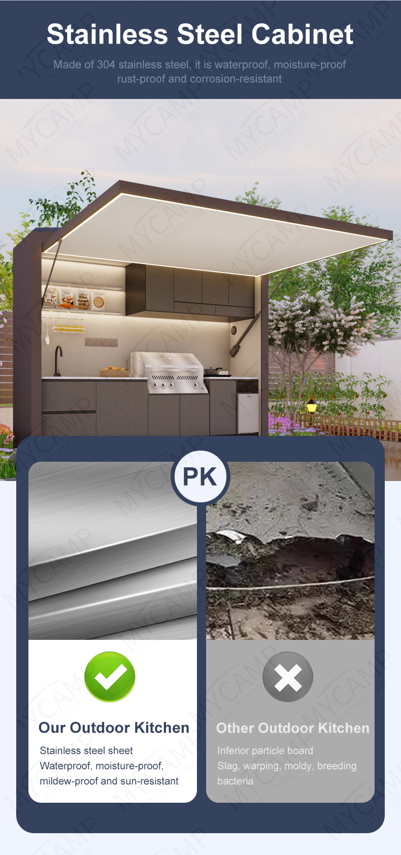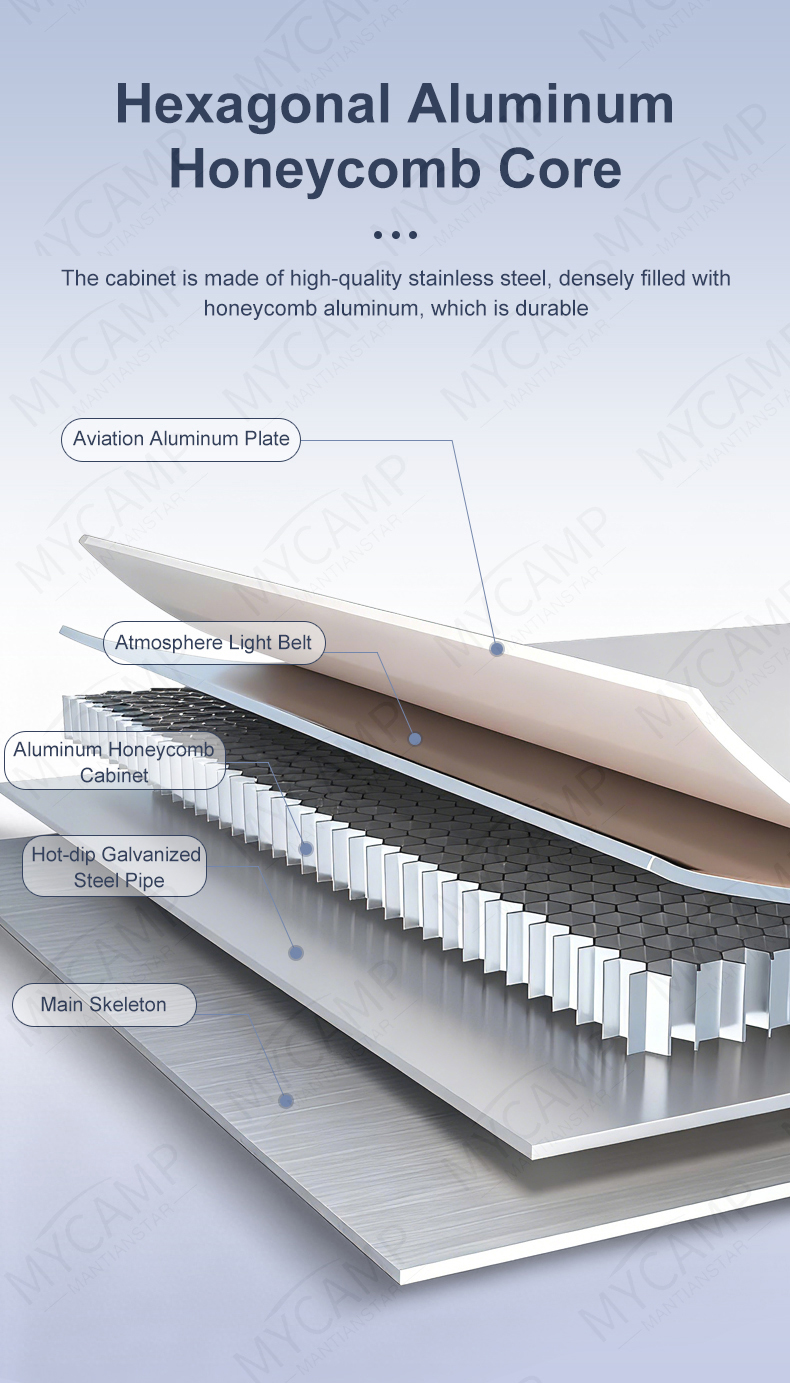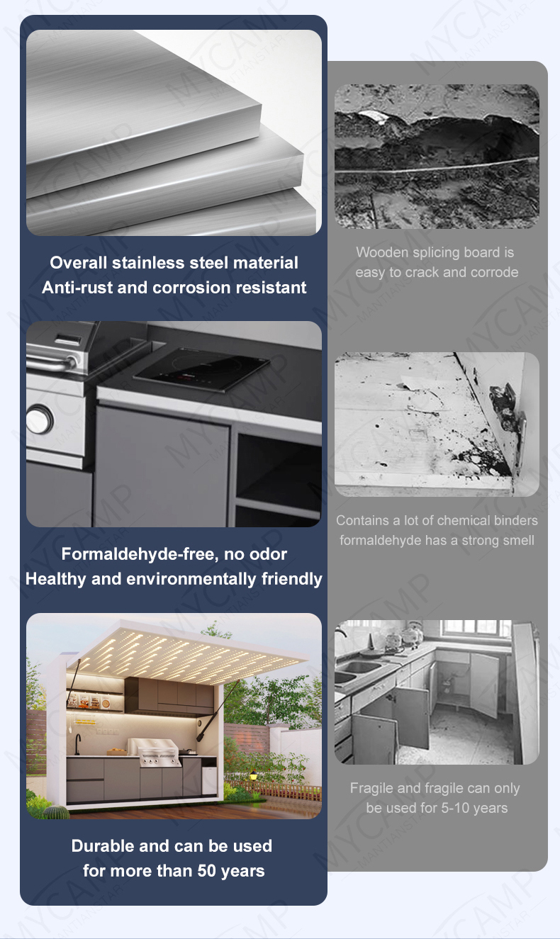 Premium Materials: Cabinetry made from 304 stainless steel or aluminum offers waterproof, moisture-resistant, rust-proof, and corrosion-resistant properties.
